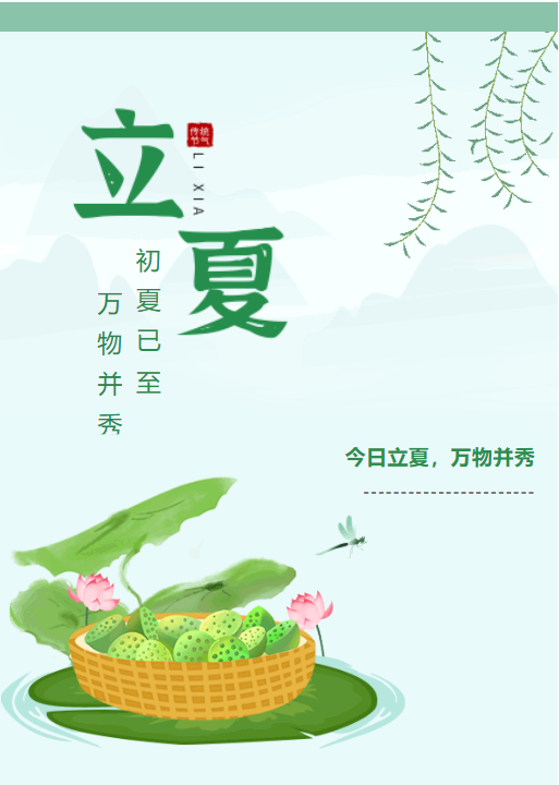 立夏,是二十四節(jié)氣中的第7個(gè)節(jié)氣,夏季的第 一個(gè)節(jié)氣。立夏后,日照增加,逐漸升溫,雷雨增多。立夏表示告別春天,標(biāo)示著萬物進(jìn)入旺季生長(zhǎng)階段。時(shí)至立夏,萬物繁茂。立夏這天,許多地方有吃“立夏飯”、吃蛋、秤人和嘗三新等習(xí)俗。