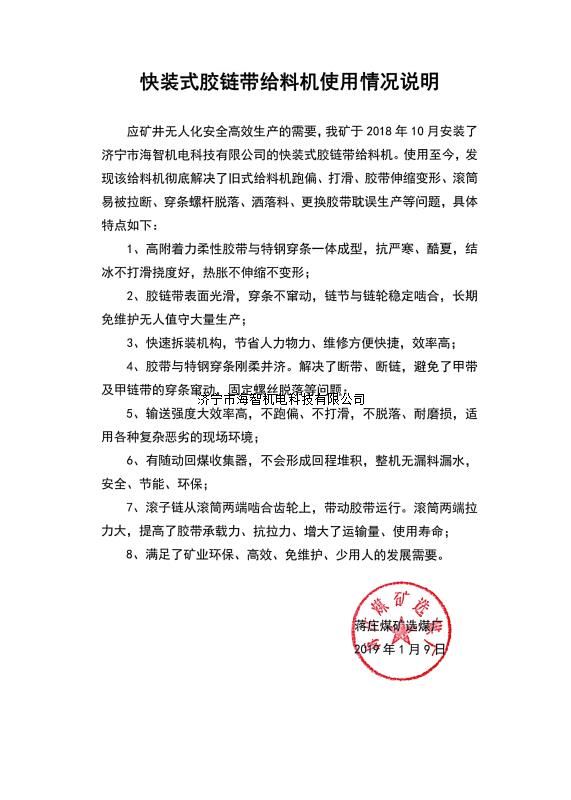 快裝式膠鏈帶給料機(jī)可實(shí)現(xiàn)完美替代物料運(yùn)輸系統(tǒng)在用的所有形式的給料機(jī),包括甲帶給料機(jī)、帶式給料機(jī)、振動(dòng)給料機(jī)、往復(fù)式給料機(jī)、鏈板給料機(jī)等,膠鏈帶給料機(jī)更好的解決了跑偏、打滑、換裝困難等問(wèn)題,更利于實(shí)現(xiàn)快速裝車、高效自動(dòng)化的現(xiàn)代智能運(yùn)輸系統(tǒng)要求。